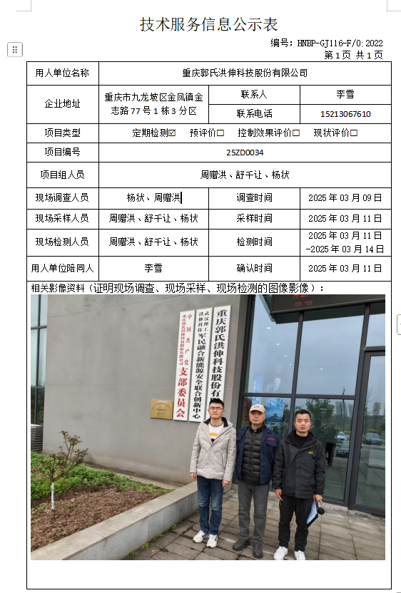 重庆郭氏洪伸科技股份有限公司定期检测项目公示