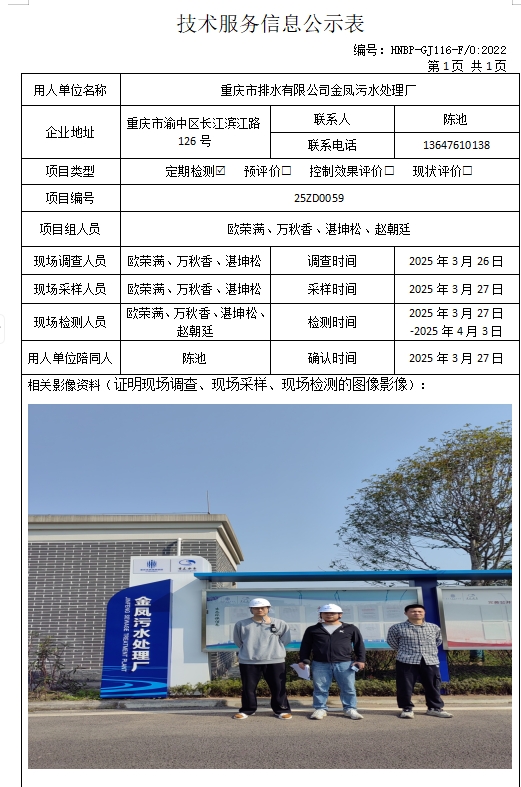 重庆市排水有限公司金凤污水处理厂定期检测项目公示