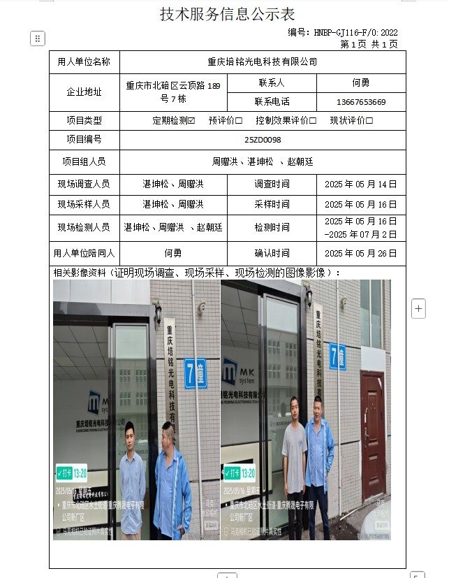 重庆培铭光电科技有限公司定期检测项目公示